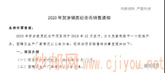 有网友透露了内部消息《2020年贺岁银质纪念币销售通知》中提及,“2020年贺岁银质纪念币项目将于2019年12月发行”,这个消息具有重大的意义,因为它意味着鼠年生肖流通纪念币也将于12月发行了。